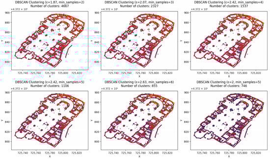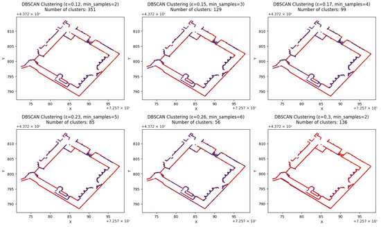 Based on the workflow outlined in the previous section, the floor plan of the cathedral was generated using the points obtained through the routine above. As shown in Figure 10, adjusting the radius (ε) value of the DBSCAN algorithm was necessary to achieve greater accuracy in point clustering.