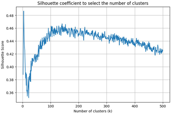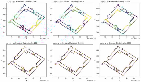 The silhouette coefficient is used to determine the number of clusters, which evaluates the quality of the clusters based on the similarity of the points within each cluster and the difference from the points in other clusters. A high silhouette coefficient indicates that the points are well grouped. Based on this method, it has been established that the optimal number of clusters for the points of the Chapel of the Holy Chalice is 106 (Figure 8).