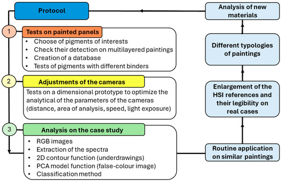 To validate the method (Figure 1), an initial test was conducted on wooden panels with known painted layers (refer to Section 2.1.1). This test aimed to establish a small reference database comprising the most common pigments encountered by conservators and heritage scientists within the Archbishop’s Palace collection. As shown by Figure 1, the facilitated protocol was intended as a reiterative protocol, expanding the application by adding references in dependence on the pigments of interest. The development of these reference-painted tablets was planned to assess the different sensitivity in depth between the applications of the VNIR and SWIR cameras when analysing multi-layered materials with different binders. Additionally, it was considered that the reflectance spectra might be influenced by the optical opacity or transparency of the painted layers.