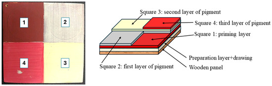 Eleven of the reference panels (Figure 2) were prepared, leaving the priming layer in the top-left square and painting the remaining area with the first painted layer. The third and fourth squares were then painted with the second painted layer. Finally, the third painted layer was applied in the fourth square only. The various arrangements of the pigments are listed in Table 1.