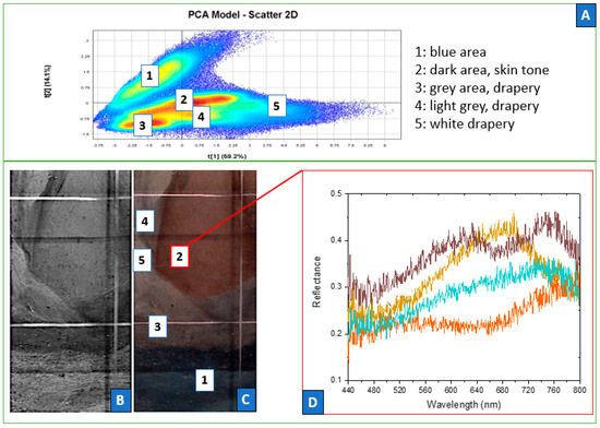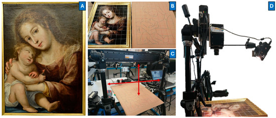 An exploratory investigation was conducted using a real case study to apply the hyperspectral imaging method and data analysis on a 17th-century oil painting, Virgen con niño, by an anonymous artist, today stored in the Archbishop’s Palace in Seville (Figure 3A).