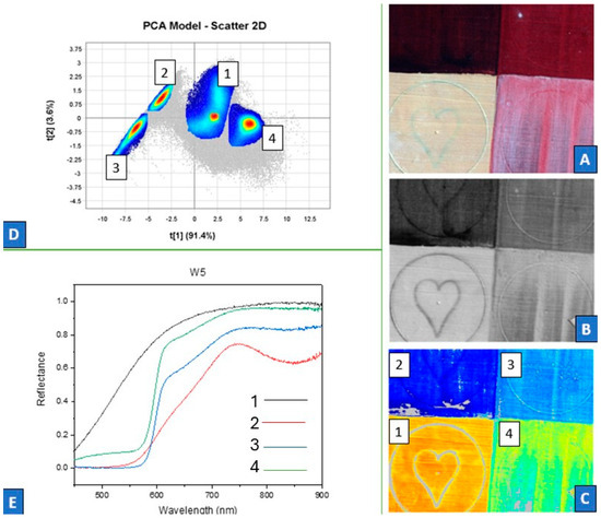 Data obtained from the VNIR hyperspectral camera mounted on the motorised stage: calibrated RGB image from panel W5 (A), image at 800 nm (B), false−colour image (C), PCA model graph (D), and spectra (E). The surface of the squares consists of white lead (1), haematite (2), vermilion (3), and lead−tin yellow (4). The false−colour image reflects their differentiation within four clusters of the PCA model graph (D). The image at 800 nm (B) shows the difficult detection through opaque pigments and multiple layers in the third and fourth areas. The spectra confirm the detection of lead-tin yellow (~500 nm) with the underneath layer of vermilion (617 nm) and haematite (743 nm).