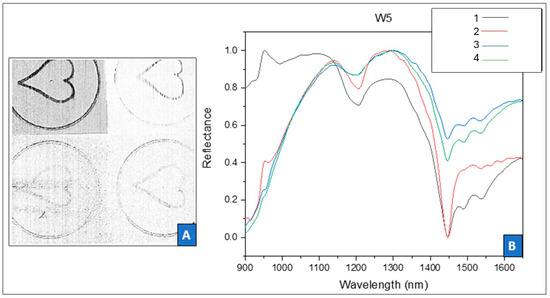 SWIR image of the W5 panel at 1400 nm (A) showing traces of the drawings from all squares and the spectral information coming from each area (B).