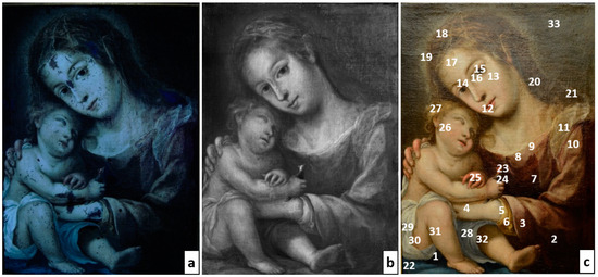 The UVL image (Figure 6a) allowed the identification of different retouches due to recent conservation interventions, which can be distinguished by the presence of bluish and brownish areas. In particular, the Virgin’s complexion showed large areas of conservation, especially on the nose and forehead, with smaller dots distributed on the cheeks and the Child’s legs and arms. Other significant areas of repainting were found on the Virgin’s left hand and the Child’s right arm. Another bright fluorescent area was identified in correspondence with the Virgin’s hair, presumably related to the presence of varnish residues.