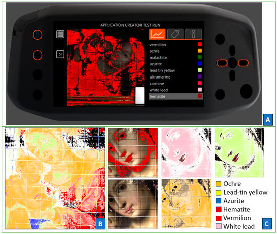 Application of the classification method for the handheld VNIR hyperspectral camera using Specim IQ® software: test for fast in situ analyses run after the creation of the library (A), stacked images of the distribution of the main pigments (B), and a series of images showing the distribution of the pigments in a selected area (C).