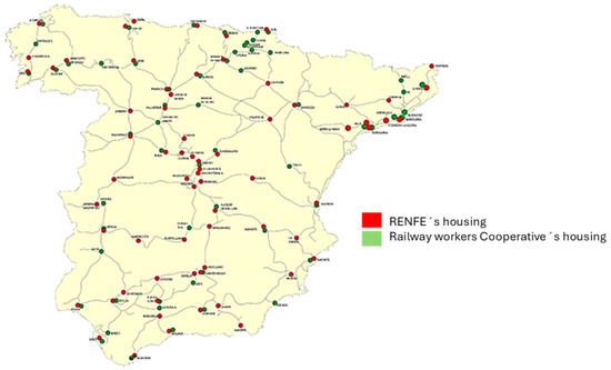 Location of housing designed and built by RENFE for employee rental and by railway cooperatives in Spain between 1941 and 1975. This is our own elaboration.