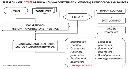 This unpublished research is a complex study on railway social housing in Spain that covers the analysis by an interdisciplinary team of housing from various points of view (historical, economic, architectural, and social, among others), where this work presents a part of the analysis of urban parameters carried out. The process followed (Figure 3) after the selection and analysis of sources continues with the selection within each field of study of the most relevant parameters. In this case, a selection of sites in the city, block typology and design of homes, and resulting spaces between blocks have been selected. To this end, the related key concepts and definitions are defined and narrowed down before data collection. The data are compiled into Excel tables, and data mining is performed by handling pivot tables and graphs. For further details of the methodology and material used, please consult our scientific blog COVIFER (see Supplementary Materials).