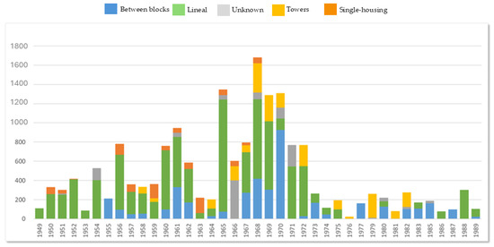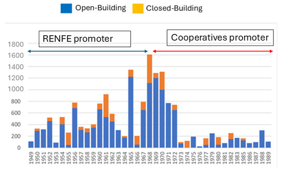 The way of making a city can be simplified in two ways: by clogging up, where, apart from the historical centers where we have not found any interior reform operation for our object of study, the model most used on pre-existing planning is the closed block; and by expansion, with the invention, after the enlargements at the beginning of the 20th century, of the open block in nuclei with a more significant number of inhabitants or through groups of single-family dwellings in less populated nuclei. In both cases, they shared the general trend of building “fragments and fragments within fragments” [66] with a partial vision of the city and, on many occasions, without prior overall planning. In this sense, the construction of the railway housing developments under study follows this pattern with the conditioning factor of being located on plots owned by RENFE, both in the case of the company’s developments and cooperatives and, therefore, the selection of plots depends on the company according to its needs, without taking into account the way the city is built or the preexistent urban fabric. Furthermore, it is necessary to distinguish between the cases of RENFE and the cooperatives since, for the former, the shape, size, and allocation of plots were not regulated. Their construction often took place before the development of any type of planning, while for the latter, the opposite was the case, and this conditioned shape and volume, among other things, as we shall see later on. Another interesting point is that the RENFE developments allow us to observe the evolution from the closed block, passing through the transitional blocks to the open building. At the same time, it is impossible to observe this evolution in the cooperatives because they were built later (since approximately 1965) in more peripheral areas of the cities with a predominance of open buildings. Concerning the period analyzed in both RENFE and cooperative developments, the predominance of the open building typology is evident throughout the period studied (Figure 4).Thus, we can define a closed block as a group of buildings between party walls forming an enclosed polygon with the creation of an interior space occupied in different ways: either as a private open space, as can be seen in Calle Jorge Juan in Albacete (1952) or at Number 308 Avenida Diagonal in Barcelona (1964), both belonging to RENFE; or for commercial use and ground floor premises, as in Calle Marqués de San Esteban in Gijón (1959), belonging to the Langreo Railway Company.
