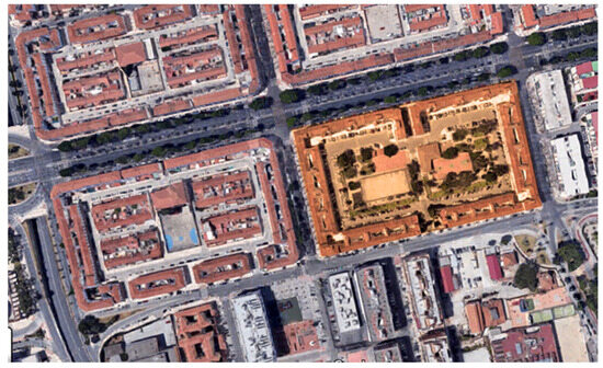 The rail workers’ dwellings were located near the railway stations and other facilities crucial for the operation of the railway, such as workshops and locomotive depots. Any statement to the contrary would be surprising since, on the one hand, with its land, the railway company RENFE could make a new allocation for this use at little cost, and, on the other hand, the proximity to the workplaces continues to be a highly valued advantage, both by companies and by workers. Otherwise, travel costs would negatively penalize the option of new homes. Thus, most of the houses built in the period studied were built on railway land, as we have seen above. Although, at present, within the urban landscape, the spaces are only sometimes identifiable as railways since the environment has been wholly reclassified and the houses have been integrated into the neighborhoods. The homes built by RENFE in the Plaza de Embajadores in Madrid or on the Paseo de la Alameda in Valencia may lead to the mistake of thinking that they were land acquired by companies for this purpose, but this is different. However, they were spaces that already had an old railway use. Thus, in the case of Madrid, it was the transit area of the link line between the Mediodía station (Atocha) and the North station (Príncipe Pío), with a link to the Delicias station, so when the renovations of use in this area began, where the Peñuelas and Paseo Imperial freight stations were also located, the reallocation of use proved relatively easy for the railway company. In Valencia, the Alameda buildings were next to the old station of the Central de Aragón Company, which connected the Levantine capital, through Sagunto, with Teruel and Calatayud, so that, when a large part of the railway services began to be deactivated at this point, the installation of housing was quite logical. Nowadays, both spaces are not easy to identify as being used by rail and are located in an urban area of some prestige. Another example would be that of Sevilla, especially in the neighborhood of San Jerónimo, in the north of the city, which we have also mentioned, the point where the main line arrived, which, through the Guadalquivir Valley, connected Sevilla with Madrid, and where workshops and depots for steam and diesel traction locomotives were also installed. Today, there is hardly any evidence of steam workshop warehouses, semi-abandoned and unused, so the successive housing developments of RENFE and railway cooperatives are not easily assimilated into their railway past. In addition, as in these and other cases, together with the construction of housing for its employees or the transfer of land for the cooperatives, RENFE also agreed with the municipalities to exchange land for other housing developments of the INV or social equipment, integrating everyone into the new neighborhoods created. As happened in San Cristóbal de los Ángeles, in the vicinity of the workshops of Villaverde Bajo, on the other side of the tracks, where the city of Madrid widened, there RENFE built a significant housing development that was to benefit above all the workers of the Central Repair Workshops (TCR) of Villaverde. RENFE also agreed to develop other services, where an agreement was reached with the Madrid City Council to cede land for the construction of other homes and a public school (Figure 11).