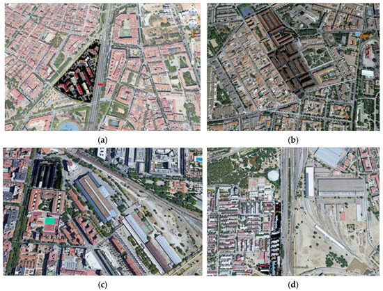 Location of some housing developments in densely urbanized areas of Barcelona, Ciudad Real, and Madrid. Source: our own elaboration from GIS. (a) Groups of 9 blocks and 659 homes of the San Andrés Arenal cooperatives in Barcelona, next to the old General Workshop of RENFE wagons; (b) groups of 32 blocks and 604 homes of the Ciudad Real cooperative, next to the land of the old MZA station in the city; (c) groups of 248 RENFE homes next to the Delicias station (Madrid) and railway facilities; (d) groups of 15 blocks and 504 homes in San Cristóbal de los Ángeles (Madrid), next to the railway workshops.