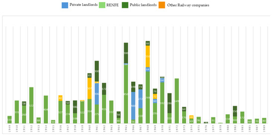 The study of railway stations, especially the passenger building, but also other associated facilities such as workshops and warehouses, among others, has explained the stellar role assigned to the passenger building as a reference space in the urban fabric and as a representation of the company that built it [6,7,8]. In this panorama, reference studies have been carried out about the leading railway companies that were established in Spain (Northern et al.) [9,10,11] and that, with the arrival of Franco’s regime, merged to create in 1941 the state railway company called RENFE (National Network of Spanish Railways), which absorbed the old railway companies existing in the country becoming the most critical company (size, employment, and assets) in the country until the 1970s [12,13]. Thus, as a symbol of industrialization and a strategic element in the city, the railway also became an exciting urbanization agent since it had abundant land to be reclassified, making it a critical strategic actor [14,15]. In addition, at the domestic level, the company needed to free up land urgently to provide housing for its workers.