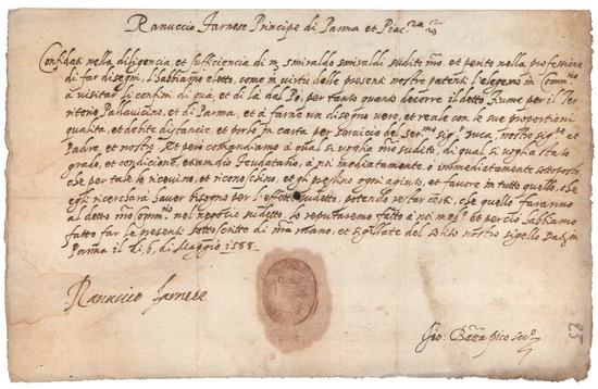 License issued by Ranuccio Farnese, Prince of Parma and Piacenza, to Smeraldo Smeraldi on 6 May 1588 for the survey of the borders of the Duchy (in Italian, Parma State Archive).