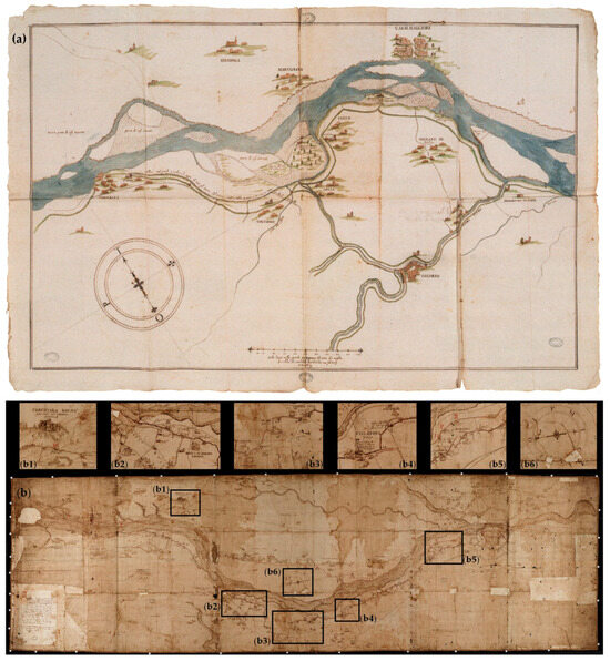 (a) Stretch of the Po River and the tributary Parma River (Smeraldo Smeraldi, 1598) and (b) Parma River course from Langhirano to the city. Along the Canale Maggiore, running aside the Parma River right bank, mills, farmhouses, courtyards, and roads are depicted (b1–b6) with toponyms in Italian (270 × 79 cm, Smeraldo Smeraldi, 1599, Parma, State Archive, Congregation of Quarries maps, Vol. 14, 1).