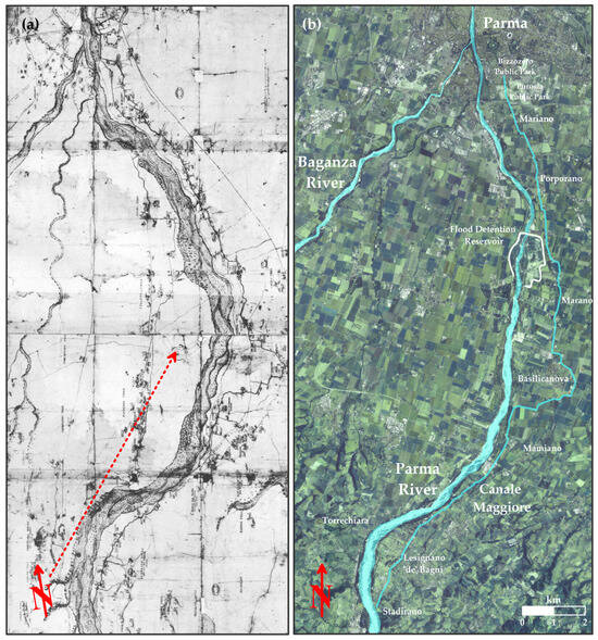 (a) Parma and Baganza river system and layout of the Canale Maggiore in detail of the Smeraldo Smeraldi 1599 map of Figure 3b, compared with (b) current ortho-image of the Parma river system with the course of the Canale Maggiore and main inhabited centers evidenced. Please note the astonishing accuracy of the map drawn by Smeraldo Smeraldi over four hundred years ago, at the dawn of the 17th century, in reproducing the waterways and their orientation indicated by the red arrows (the arrow in Figure 4a is oriented approximately 10° towards the west from north, as from the direction present in detail on the Smeraldi map).