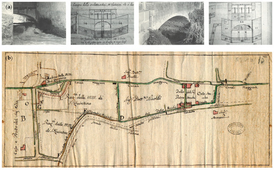 Smeraldo Smeraldi, dealing with the entire water system of the province of Parma and Piacenza, produced numerous maps of the territories of the Duchy (Figure 3a [40]). His skill as a surveyor, documented by multiple archival documents and maps, was praised by contemporaries for accuracy [16,41]. Countless maps and drawings made by Smeraldo Smeraldi concern the Canale Maggiore (examples in Figure 3b, Figure 4a, and Figure 5a).