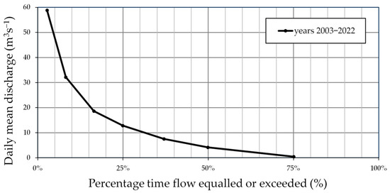 Indispensable for the evaluation of hydroelectric producibility is the knowledge of the period in which the water resource is available in the watercourse and, therefore, can be exploited. This information is synthesized by the flow duration curve (FDC), usually available at water level measuring stations along the streams. Since no stations are available for the Parma River near the Canale Maggiore intake, reference was made to the flow duration curve at Ponte Verdi, located in the city center (about 20 km downstream of the intake), which is nevertheless adequate for the evaluation of the percentage time flow which is equaled or exceeded, even in the upstream stretches, due to the characteristics of the river and the basin. The considered flow duration curve is presented in Figure 9 with reference to the period 2003–2022 [50]. A summer drought lasting approximately 90 days is evident and this corresponds to a maximum period of about 275 days in which a flow can be observed in the Parma River allowing the canal to be fed. The almost total absence of flows in the summer period requires the utmost attention to safeguarding the exploitation of the resource, available only for 75% of the year. From a climate change perspective, it is legitimate to ask whether the conditions observed in the last twenty years can remain valid for the years to come. A broad scientific debate is nowadays underway regarding FDCs. However, given the complexity of the chain of phenomena that lead to the formation of flows in natural watercourses, to date, there is no definitive answer to the question, and very complex studies should be conducted at the basin scale [51,52]. In the context of applications to minor and artificial watercourses, especially in the case of a very modest derived discharge with reference to the average daily flow rate of the main watercourse (<10%), however, a possible future reduction in average outflows is expected to exert only minimal impacts on the derived flow rate, once the intake structure has been adequately designed [53].