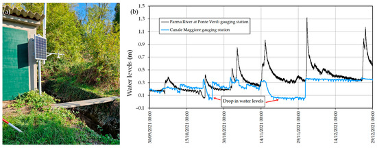 (a) Water level gauging station on the Canale Maggiore (site of Figure 6c) and (b) example of sudden drops in water levels due to obstructions during floods in Parma River.
