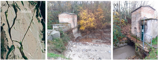 Intake from Parma River: (a) aerial view of the channel dug into the riverbed to allow the collection of water from the Parma River, (b) upstream view of the old intake building after a severe flood event that caused the obstruction of the system, and (c) downstream view of the intake building after the same flooding event: still water is present in the canal due to the obstruction.