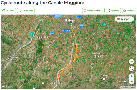 This existing itinerary, which extends over a total distance of 25 km with a difference in altitude of approximately 200 m, therefore considered as an easy-to-follow route, runs along the floodplain of the Parma River, offering lovers of the environment and outdoor sports a dedicated route, also practicable on foot and on horseback, connecting Lesignano de’ Bagni and Parma [86]. Rest areas and water supply areas could be set up along the new cycle route, as well as explanatory panels and totems illustrating the points of interest in the context of the waterway’s area of influence. Significant stages of the route can also be identified in at least three mini-hydro sites where a catering business is present (Figure 6h,j,n), which could provide services for cycle tourists travelling along the itinerary dedicated to the Canale Maggiore. Given the context related to sustainable energy production from renewable sources, charging stations for battery devices (electric bikes, smartphones, etc.), using solar power, or even powered by the energy produced by the hydroelectric plants located on the canal should be provided along the cycle route. Due to the waiting time, the stations should be preferably installed at pleasant points of interest for the cyclists to visit during recharge [87]. A route for the cycle path along the Canale Maggiore was identified by the authors and is already available [88] (Figure 14).