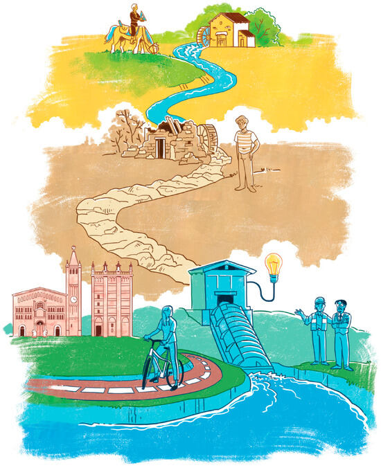 Transdisciplinary approaches can allow us to glimpse virtuous valorization strategies even in very degraded contexts. For this reason, we tried to address the issue of conservation of the historical and cultural heritage of the artificial waterway of interest, starting from a technical perspective inspired by the former productive vocation of the district. As a result of the impulse given by the Europe Green Deal [90,91] and the REPowerEU [92] plan that promote the massive upscaling and speeding-up of renewable energy in power generation, it was possible to outline the main features of a valorization intervention, based on the roots of the exploitation of the energy of the waters that dates back to a very distant past. The real feasibility of this technical proposal must obviously be assessed on the basis of effective planning and economic evaluation tools. The better the estimate made of the costs and economic potential deriving from the activities aimed at restoring the hydroelectric exploitation of the watercourse, the greater the chances of a successful outcome of the intervention. Fortunately, relating to this type of application, the technical–scientific literature provides multiple estimation tools that allow us to evaluate the best strategy, whether one wishes to obtain greater power, maximizing long-term profit, or whether one intends to carry out a modest intervention, aimed mainly at the conservation of cultural heritage and the stimulation of cultural interest. Perhaps, more immediately recognizable, the cultural, educational, useful, and pleasant leisure and entertainment values linked to the Canale Maggiore and the crossed territory are evident and deserve to be understood and rediscovered as a whole to revitalize this legacy. However, the overall implementation of the intervention requires that, on each of the three main fronts, different challenges relating to the realizations of studies and projects, that require the involvement of public and private entities, be addressed (Figure 15).