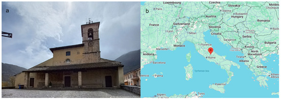 San Panfilo Church (Figure 1a) is located in central Italy, in the province of L’Aquila, in the municipality of Tornimparte, Villagrande village (latitude: 42.28864° N, longitude: 13.30136° E), at the altitude of 830 m above sea level (Figure 1b).