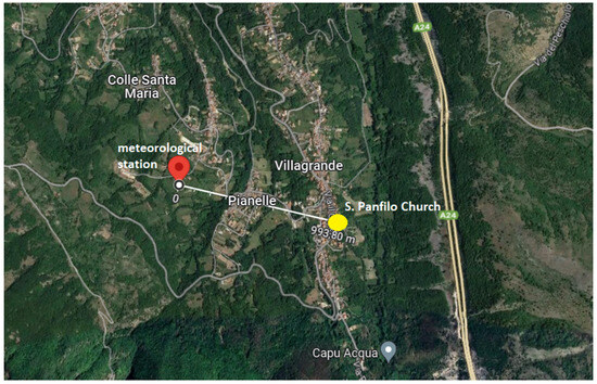 A microclimatic monitoring campaign was organized in the period from February 2021 to April 2022 with several measurement sites inside the church: one outside the church under the external portico and one at the meteorological station of Colle San Vito (latitude: 42.290639° N, longitude: 13.289556° E) managed by the Centro Funzionale and Ufficio Idrografico of Regione Abruzzo. The Colle San Vito station is located at a distance of about 1 west of the San Panfilo Church (Figure 2).