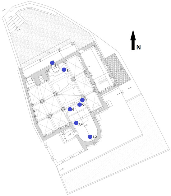 Church plan with the positions of thermo-hygrometers (blue points) installed inside the church and under the external portico.
