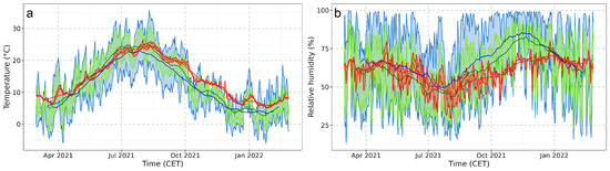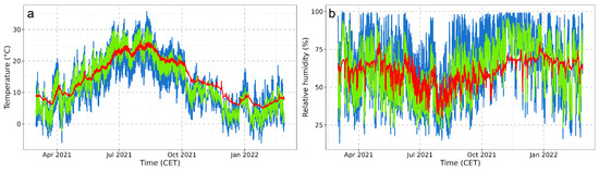 Daily excursions and monthly moving average of temperature (a) and relative humidity (b) of the sensors located in pulpit (red), portico (green), and meteorological station (blue).