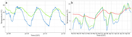 Measures of temperature under the portico (green) and at the meteorological station (blue) between 9 July and 12 July 2021 (a). Daily averages of temperature at the pulpit site (red), under the portico (green), and at the meteorological station (blue) during March and April 2021 (b).
