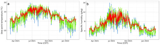 Calculated values of dew point temperature (a) and specific humidity (b) of the sensors located in pulpit (red), portico (green), and meteorological station (blue).