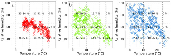 All the indoor sensors present a behavior similar to the scatter plot in red (Figure 9a), which collects the daily averages of temperature and relative humidity of the sensor at the pulpit. On average, the maximum percentages are included in the central square, where the conditions are optimal for preservation according to the standard. In the top-left square, where the temperature is lower than recommended and the relative humidity presents higher values, slightly lower values of percentages were reached. The green scatter plot (Figure 9b) represents the daily averages of the measures under the portico. In this case, the most frequent condition is represented by higher-than-recommended values of relative humidity and lower temperatures. Comparing these values to indoor conditions, the values tended to be more spread, though not as spread as those registered by the meteorological station (Figure 9c).