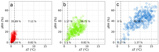 Figure 8a shows the dew point spread, which was evaluated as the difference between the measured temperature and the calculated dew point: