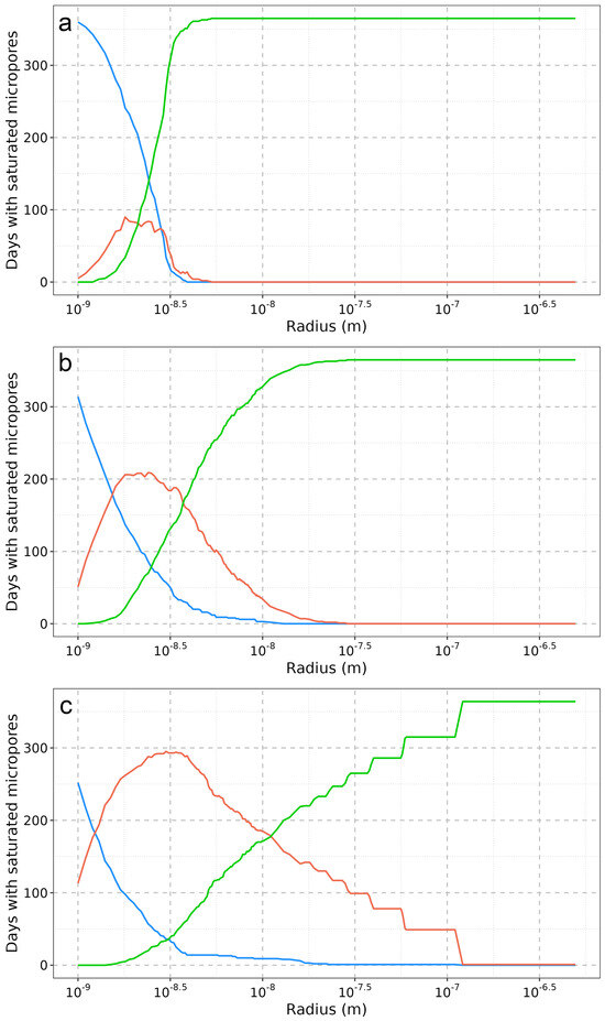 Number of days of saturated micropores as a function of their radii in pulpit (a), portico (b), and meteorological station (c). Blue, red, and green represent the number of days with always, sometimes, and never-saturated micropores, respectively.