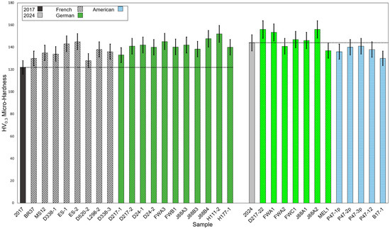 As a first approach, the micro-hardness was measured and analysed according to the metallurgical parameters: primarily the elemental composition of the alloys. Micro-hardness results for the group of wrecks are presented in Figure 3. They were divided into two groups: Duralumin alloys to the left (French in black and white stripes; German in dark green) and Super-Duralumin alloys to the right (German in light green and American in blue). They were compared to their modern equivalents (2017A and 2024) with a threshold corresponding to the modern alloys’ measured values. The main observation is the overall high hardness of the ancient Duralumin alloys compared to 2017A. Moreover, some values, especially among German samples, are even higher than a 2024 reference alloy. Similar hardnesses to the modern alloys are to be expected [30]. The measured hardnesses of modern 2017A and 2024 correspond to the literature and manufacturer tests [23].