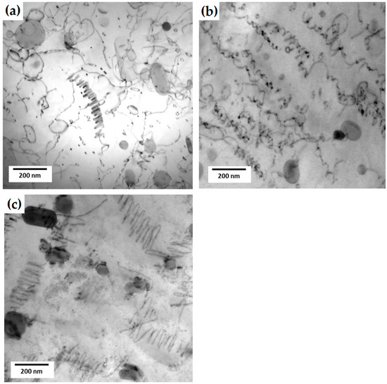 After fine precipitation, dislocation densities are the most important driver of hardening [31]. Examples of images of dislocations observed by TEM in a 2017A alloy and in the JU88 sample at the received state and after T4 treatment are presented in Figure 6. Numerous helicoidal dislocations with their axes following [011]Al can be observed in the sample at received state. These dislocations, mainly visible near the [011]Al ZA, are created during quenching of the alloy [35,36]. After T4 treatment, the dislocations are mainly helicoidal. Their fraction in the alloy is quite low. In the 2017A alloy, very few helicoidal dislocations can be seen, but there are many other types of dislocations.
