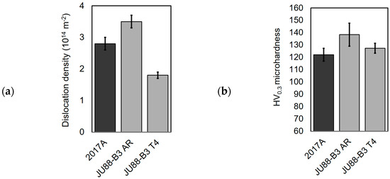 (a) Dislocation densities; and (b) microhardness values (HV0.3) for the ancient German alloy JU88-B3 (AR: as-received; T4: T4 treatment) and the corresponding modern alloy.