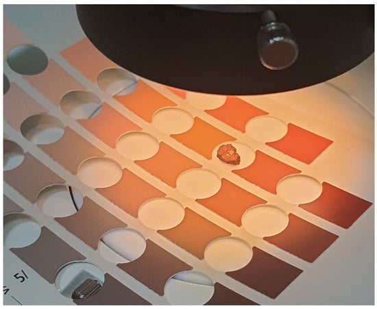 A similar method for color determination was tested in the studies of materials of African sites several years earlier [9,10], but no color calibration was performed before photographing ceramic tiles. The ‘ceramic plate streak’ approach requires partial destruction of the pigment sample; moreover, it is not applicable to small lumps or powder samples.