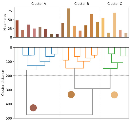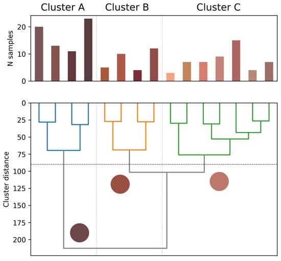 In the lower part of the figures (on the tree diagram), the average colors for each of the three clusters A, B, and C are also shown as circles.