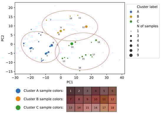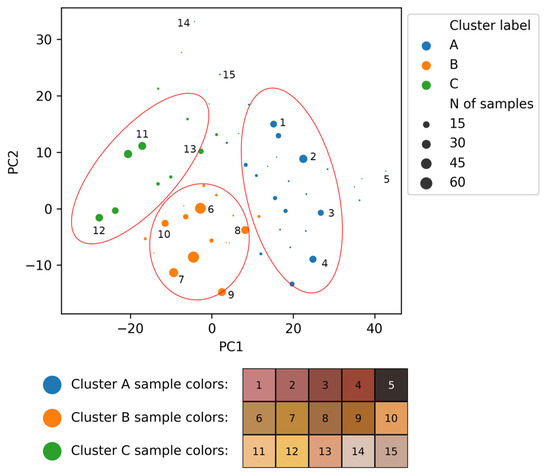To construct a two-dimensional projection of a three-dimensional dataset (e.g., CIE L*a*b color coordinates), principal component analysis (PCA) is an obvious tool of choice. This method reduces the dimensionality of the data without a significant loss of information. The new coordinates are a linear combination of the original ones. We applied the PCA to both data sets (the colors of the samples from the Kapova Cave and from the Kamennaya Balka II site) and created scatterplots in new coordinates (PC1 and PC2—the main components 1 and 2), see Figure 4 and Figure 5 and corresponding Figures S7 and S8 from the Supplementary Materials. The size of each dot on the scatterplot indicates the number of single observations of this particular sample color. Due to the discrete nature of colors in Munsell tables, many samples are described by exactly the same color, thus complicating the interpretation of a simple scatterplot. The colors correspond to the colors of clusters A (blue), B (orange), and C (green) in the tree diagrams (Figure 2 and Figure 3). The lower part of the figure also shows the colors of some arbitrary chosen samples, indicated in the scatterplot by numbers. Red ellipses indicate the area in which samples belonging to a particular cluster are located with a probability of 95% (that is, 2 sigma).