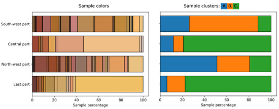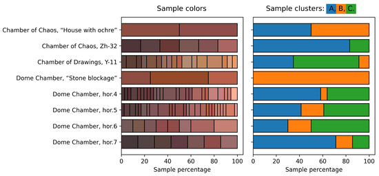 Information about the colors and their correspondence to a particular color cluster for different locations of the Kapova Cave is presented in Figure 6. Similar information for Kamennaya Balka II is presented in Figure 7. The X axis shows the proportions of samples belonging to a particular color or cluster. The cluster designations correspond to the designations in the previous figures.