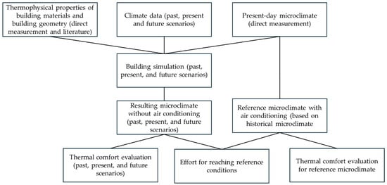 The procedural scheme is visualized in Figure 1. In particular, the following subsections outline the rationale behind the reference indoor conditions imposed during the simulations, describe the building characteristics as input for the energy modeling simulations, and explain the methodologies used to define the three climate scenarios—past, present, and future.