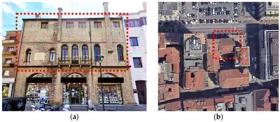 Images of the building: (a) northern façade of Casa dell’Angelo. The building’s features have not changed since the 1930s. Nowadays, the ground floor is used for commercial activities, while the first and second floors (red box) host the quarters of Associazione Gabinetto di Lettura e Società di Incoraggiamento. (b) Aerial view of the urban context; Casa dell’Angelo building is indicated by the red box.