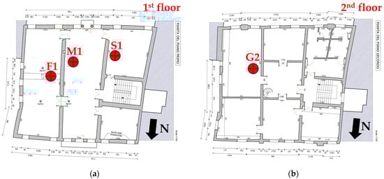 Layouts of the building: (a) first-floor plan, (b) second-floor plan. The rooms of interest are marked with codes corresponding to those listed in Table 2. Red markers indicate the monitored positions, placed at heights between 1.5 and 2 m above the floor level.
