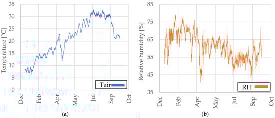 The present dataset has been obtained using the data of the Botanical Garden weather station (Regional Environmental Protection Agency of Veneto), 1.2 km south from the Casa dell’Angelo (Botanical Garden station coordinates are Latitude: 45.3993 and Longitude: 11.8805). Temperature and relative humidity measurements have been available at hour resolution since October 1993. In this work, 2009–2018 data have been used, because in 2019, the station was relocated [32]. A year dataset has been calculated by averaging the hourly data of the chosen period.