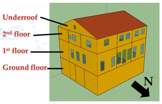 Simplified 3D model of Casa dell’Angelo used in the energy simulations, viewed from the northeast. The main façade faces north. The building is modeled with four stories, including the underroof and ground floor, as well as the 1st and 2nd floors where the rooms studied in this research are located. In these floors, the internal space is subdivided by internal partition walls to reflect the actual layout.
