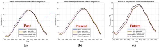 Comparative graphs illustrating average internal air temperatures in the reference rooms (colored lines) at different times: past (a), present (b), and future (c) against external temperatures for each historical epoch (dotted line). These graphs reveal significant trends, highlighting how internal temperatures have adapted to seasonal changes and external climate influences over time.