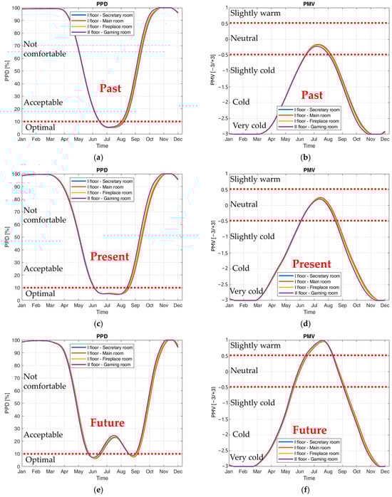 Predicted Mean Vote and Predicted Percentage of Dissatisfied values for each reference room across the three historical epochs, under uncontrolled indoor conditions (i.e., without any air conditioning). The analysis is presented in pairs, with PMV and PPD values depicted for each epoch: (a,b) for the past (pre-climate change), (c,d) for the present years, and (e,f) for the future forecast. These figures provide insights into the comfort levels experienced in the reference rooms, illustrating how thermal comfort has evolved over time. Red dotted lines indicate limits, respectively, 10% PPD and ±0.5 PMV, that are commonly used as a boundary for optimal/neutral conditions.