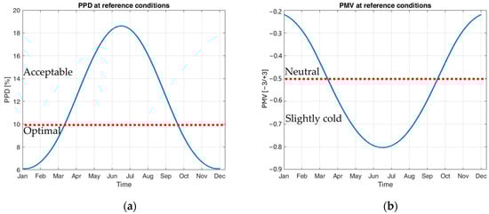 Predicted Percentage of Dissatisfied (a) and Predicted Mean Vote (b) values for the suggested indoor reference conditions based on the historical microclimate data. These figures offer insights into the comfort levels experienced in the rooms, demonstrating how thermal comfort is balanced with conservation needs. Stricter conservation conditions could negatively affect comfort and may even pose a risk to preserving items that have adapted to a specific microclimate. Red dotted lines indicate limits, respectively, 10% PPD and −0.5 PMV, that are commonly used as a boundary for optimal/neutral conditions.