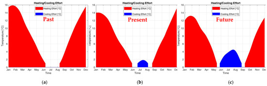 Comparative graphs illustrating the average climatization effort over time: past (a), present (b), and future (c). The effort (vertical axis) is represented as the difference (absolute values) between the set reference temperature and the temperature that would occur without any air conditioning. This differentiation allows for visualizing the effort required for heating (in red) and cooling (in blue) to maintain the desired indoor temperature. A threshold of ±1 °C has been applied to avoid frequent switch-on and switch-off cycles of the HVAC systems when the air temperature fluctuates around the setpoint.