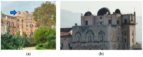 (a) The blue arrow indicates the ancient Observatory built on the roof covering the 12th-century Pisa Tower in the Royal Palace in Palermo; (b) detail of the ancient Observatory, now the seat of the Specola Museum.